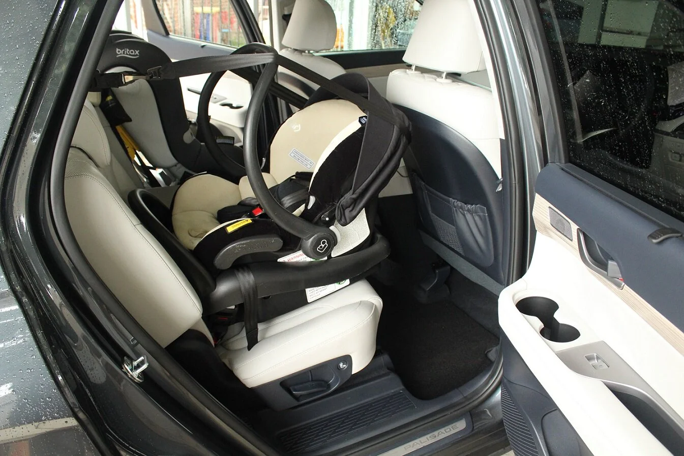Notice also, because the roof tapers inward and the floor is about a foot wider than the roof (as is the case in many new cars, not just Palisade) if it’s raining, that outboard seat, the carpet and door sill is gonna get drizzled on. So be quick.